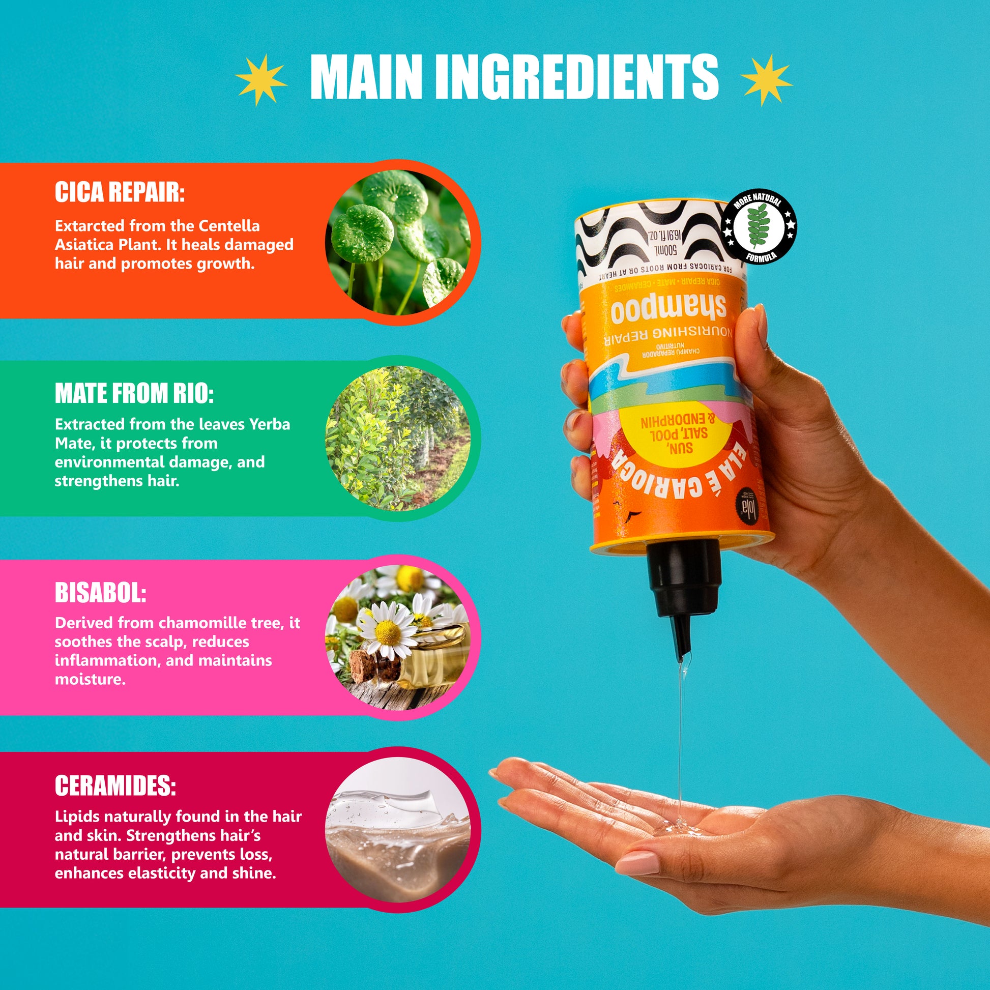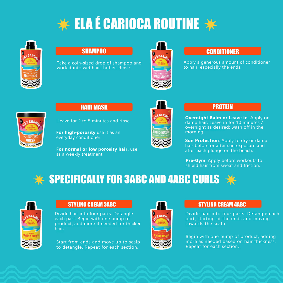 Take a coin-sized drop of shampoo and work it into wet hair. Lather. Rinse. Repeat. Follow with Ela É Carioca Sol, Sal, Piscina & Endorfina hair ritual.