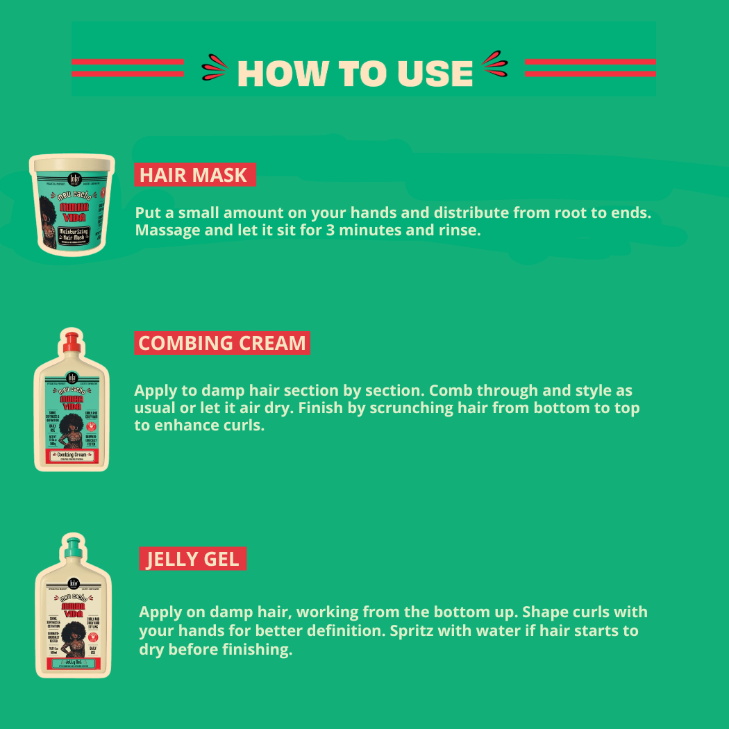 Mask: Put a small amount on your hands and distribute from root to ends. Massage and let it sit for 3 minutes. Rinse it out and finalize as usual. Combing Cream: Apply the cream evenly to damp hair, section by section. Comb and style as usual or let it dry naturally. Finish as usual, preferably by scrunching the hair from the bottom up to stimulate the curls with your hands. Can be used with Meu Cacho Minha Vida Jelly Gel for powerful finishing and amazing day afters. Jelly Gel: Use on damp hair. Apply it from the bottom up, modeling the curls with your hands to increase the definition. Pulverize with water if your hair starts to dry before you are done. Use it together with Meu Cacho Minha Vida All-In-One Combing Cream for perfect curl definition and exponentially enhanced self-esteem. #Tip: After Meu Cacho Minha Vida Shampoo and Conditioner, use the Jelly Gel in small amounts filled with love.