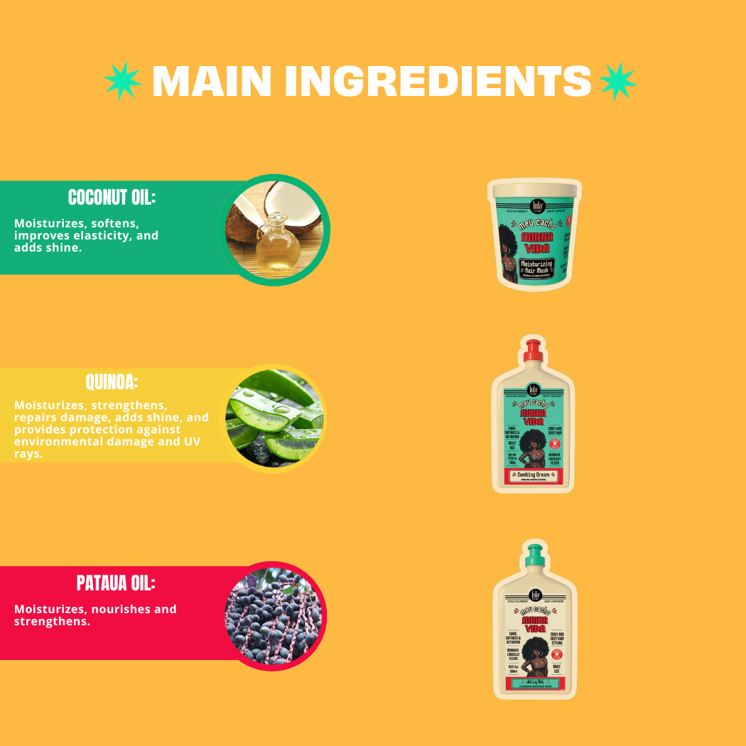 The Meu Cacho Minha Vida Kit is your perfect curl care trio! It includes our ultra-hydrating hair mask, defining combing cream, and curl-enhancing jelly gel — all designed to nourish, shape, and hold your curls with softness and shine. Ideal for curly and coily hair textures looking for moisture, definition, and frizz control.