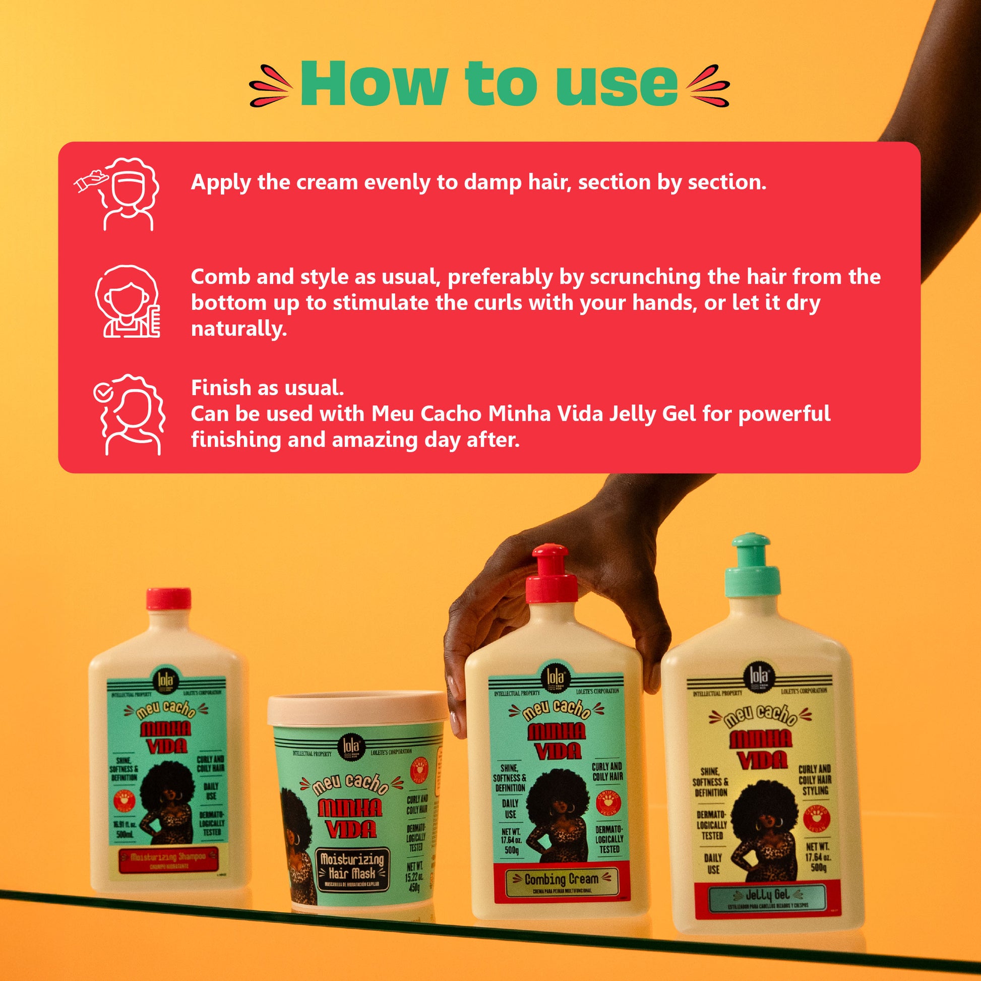 Apply the cream evenly to damp hair, section by section. Comb and style as usual or let it dry naturally. Finish as usual, preferably by scrunching the hair from the bottom up to stimulate the curls with your hands. Can be used with Meu Cacho Minha Vida Jelly Gel for powerful finishing and amazing day afters.