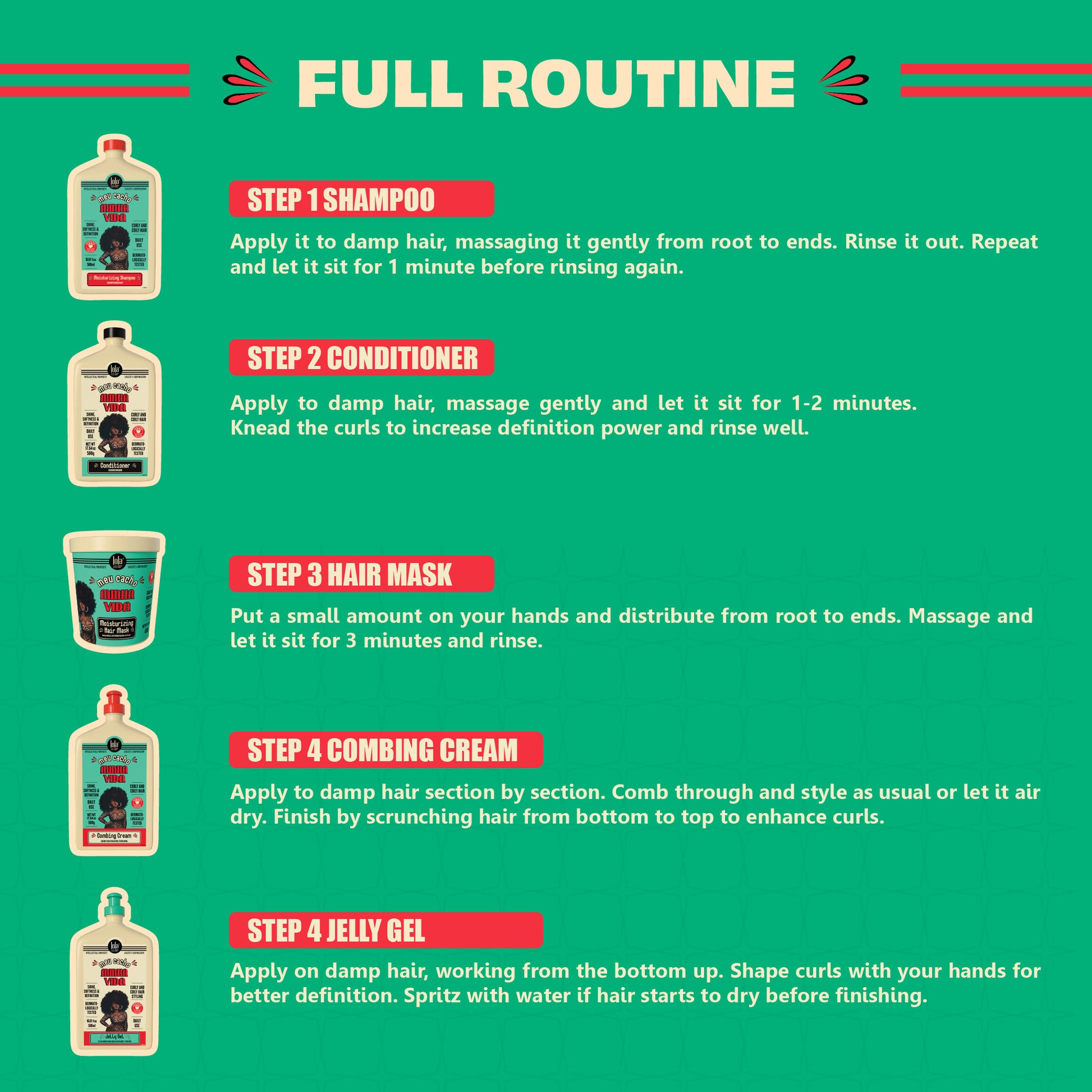 Use on damp hair. Apply it from the bottom up, modeling the curls with your hands to increase the definition. Pulverize with water if your hair starts to dry before you are done. Use it together with Meu Cacho Minha Vida All-In-One Combing Cream for perfect curl definition. #Tip: After Meu Cacho Minha Vida Shampoo and Conditioner, use the Jelly Gel in small amounts.