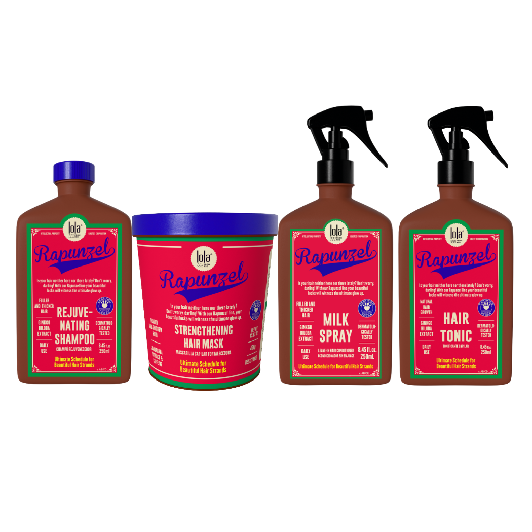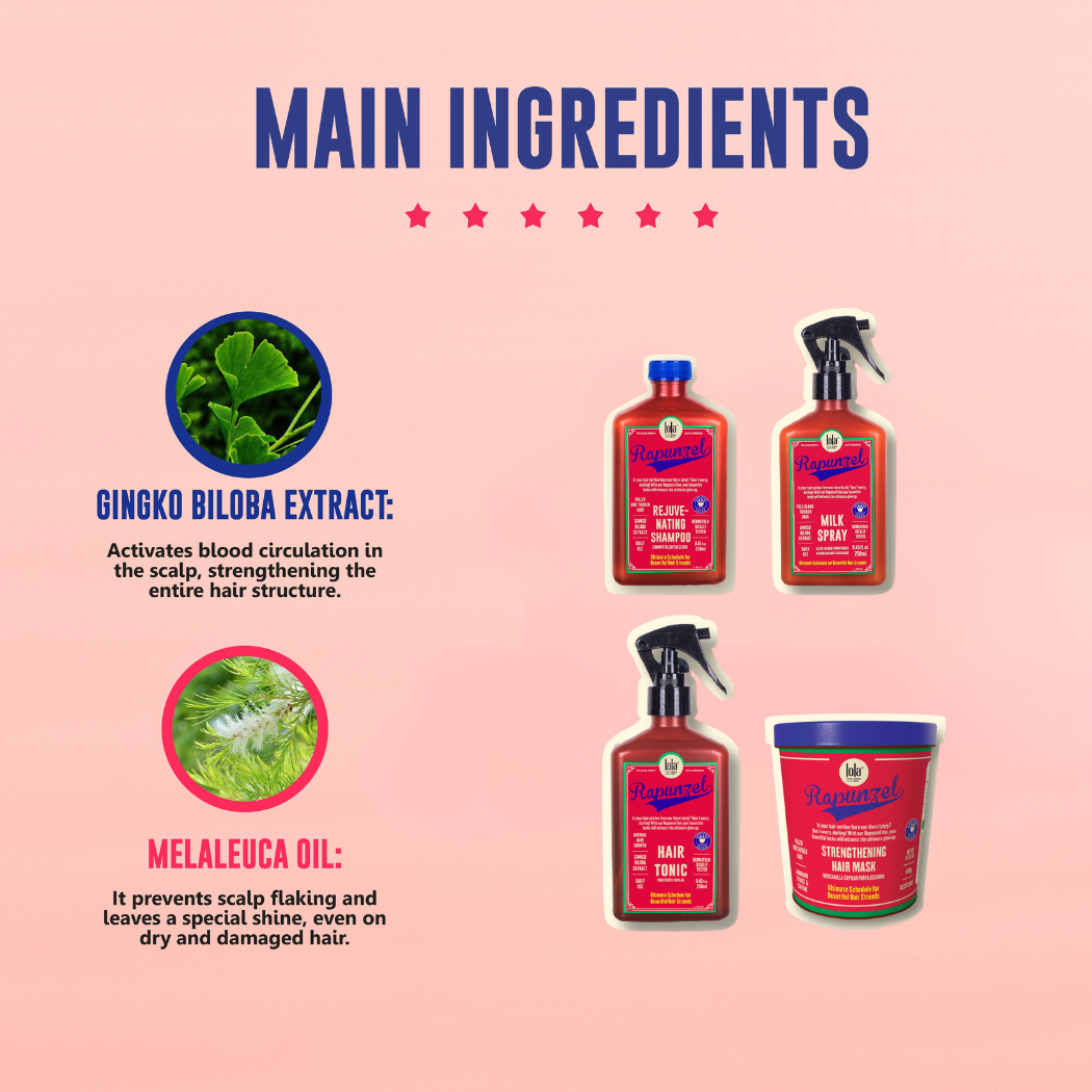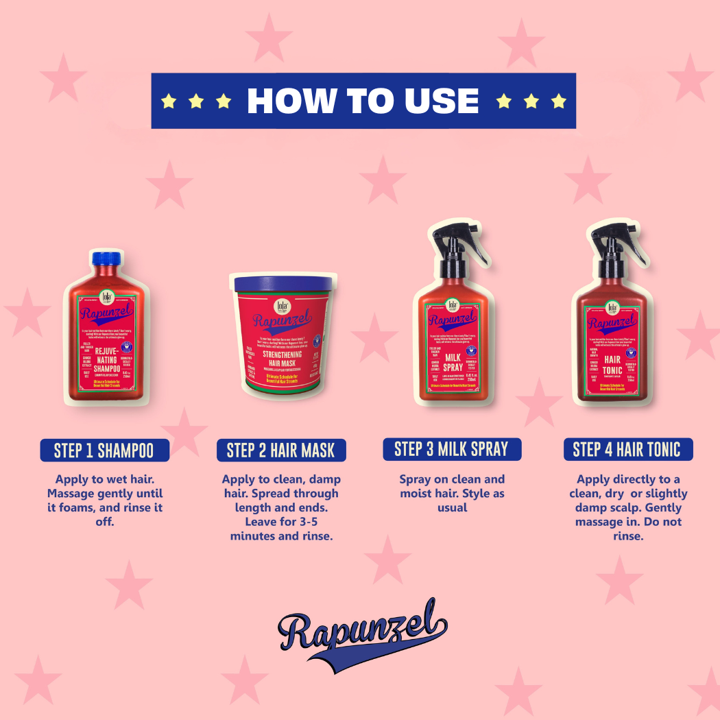 Rejuvenating Shampoo: Apply Rapunzel Rejuvenating Shampoo to wet hair. Massage gently until it foams, and rinse it off well. Repeat the procedure. Mask: Apply a small amount to clean, damp hair. Distribute evenly throughout length and ends. Let it act for 3-5 minutes and rinse well. Use weekly. Hair Tonic: After using the Shampoo, apply the Hair Growth Tonic directly to the clean and dry (or slightly damp) scalp. Massage gently. Don’t rinse. Massaging the scalp helps activate the microcirculation, boosting the results. Milk Spray: Spray on clean and moist hair. Finish as usual.